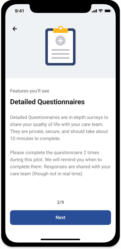 A mobile MVP was designed with structured daily symptom surveys, bite-sized educational resources, and shared dashboards for caregivers and care teams. The interface blended clinical reliability with warm, accessible language and simple flows that adapt to varying digital comfort levels.